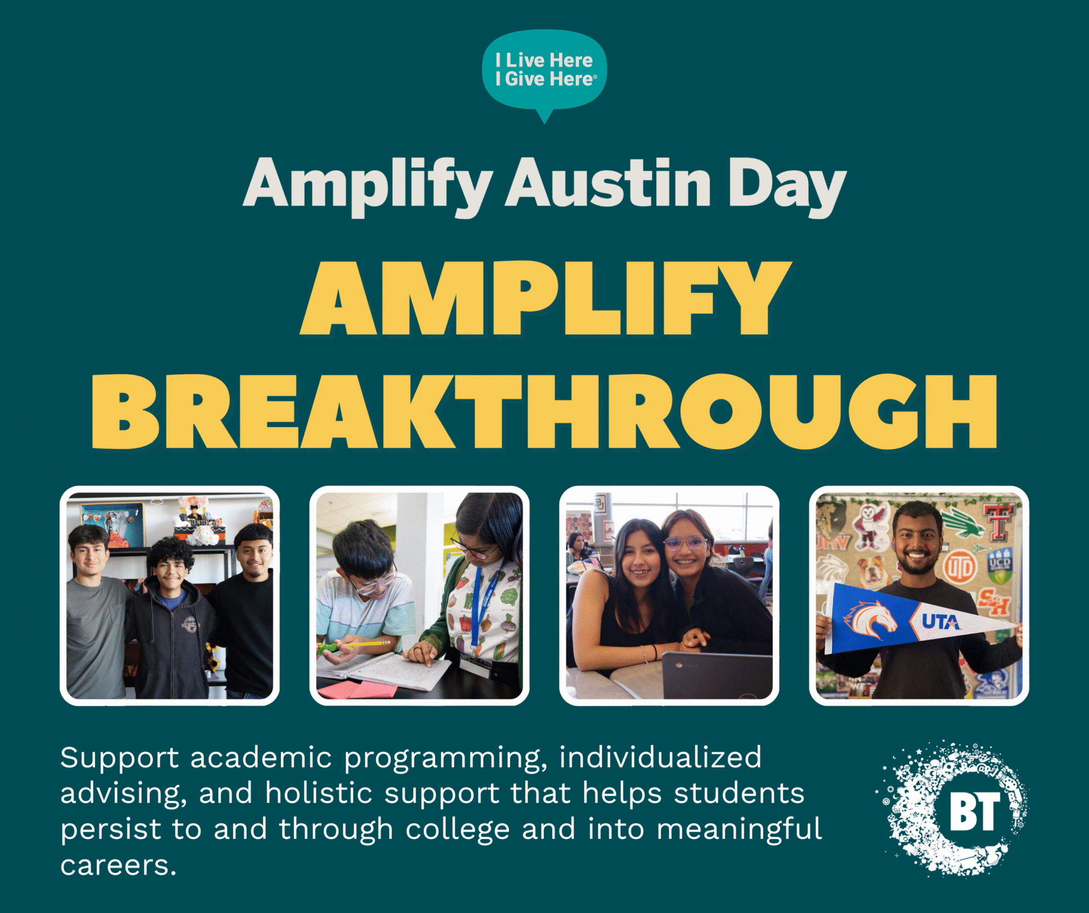 I [work at/volunteer at/support] Breakthrough Central Texas, and every day I see students navigating college as the first in their families—with determination, grit, and real barriers to overcome. That’s why I’m fundraising for Amplify Austin Day. These funds support advising, academic programming, and the wraparound support students need to persist through college and into meaningful careers.