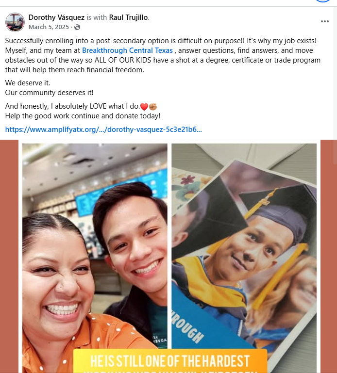 I wanted to share why Amplify Austin Day matters so much to me. I work at Breakthrough Central Texas, and every day I see students who are navigating college as the first in their families—with incredible determination and, often, very real barriers. That’s why I’m fundraising for Breakthrough this Amplify Austin. These funds support academic programming, individualized advising, and holistic support that helps students persist through college and into meaningful careers.